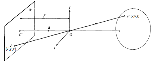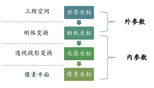 - 从相机坐标系中三维坐标到成像平面上二维坐标的透视投影变换(相机的内参数)