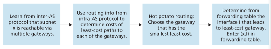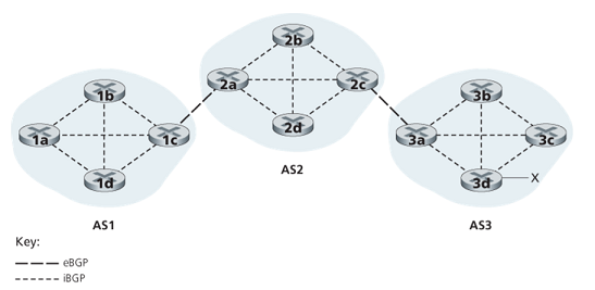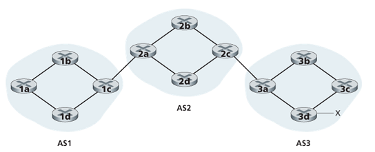 AS之间运行自治系统间选路协议(inter-AS routing,) 一个AS内部的路由器运行相同的选路算法(intra-AS routing),且拥有彼此之间的信息。 每个AS都有一个或多个负责连接外部网络,称为网关路由器。