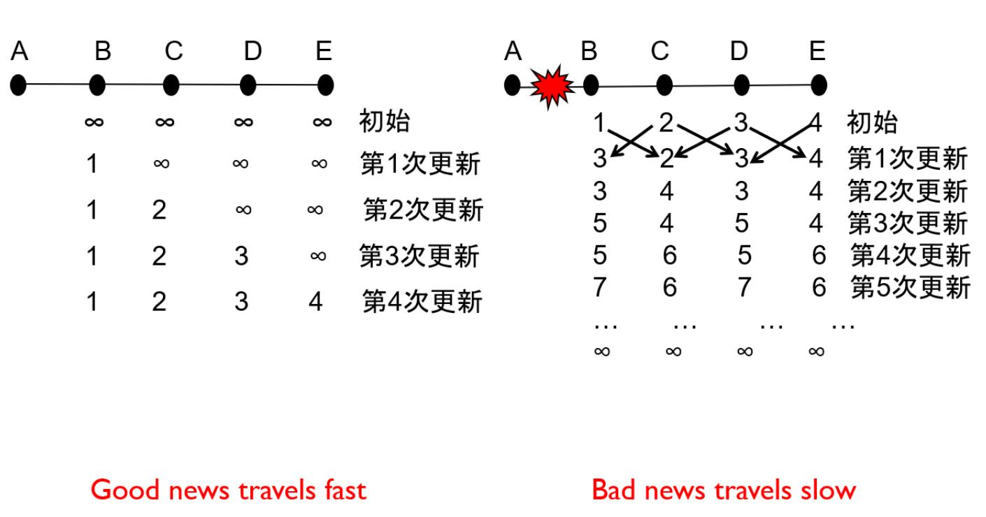 好消息更新快,坏消息更新慢:因为坏消息之前的状态会残留在邻居的通知内