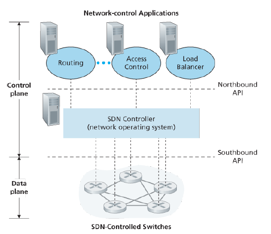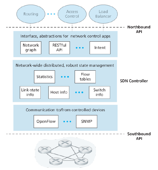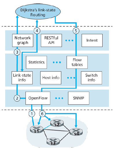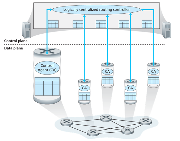 - Logically centralized control: a logically centralized controller computes and distributes the forwarding tables, interacts with a control agent (CA) in each of the routers via a well-defined protocol.
