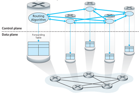 - Per-router control: a routing algorithm runs in each and every router, e.g. OSPF and BGP protocols