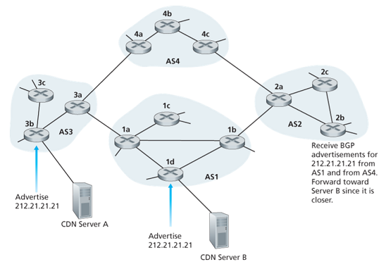 During the IP-anycast configuration stage, the CDN company assigns the same IP address to each of its servers and uses standard BGP to advertise this IP address from each of the servers.