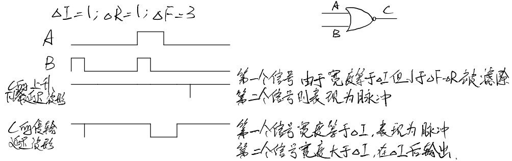 4. 惯性延迟 :为使器件转换状态,对于输入的一个变化所必须维持的最小持续时间称为元件的惯性延迟。若输入脉冲宽度不到 则会被门过滤;若大于等于 ,则器件表现出不小于 的传输延迟