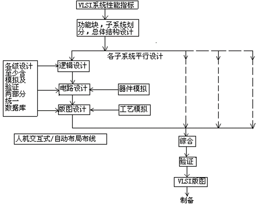 - 自顶向下:层次性设计。将要设计的 VLSI 系统逐级分解成较简单的功能,直至达到可进行高效设计的、足够简单的功能块,每一级将要完成的功能以及上一级和下一级的接口均有严格的规定;