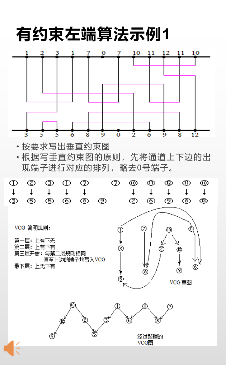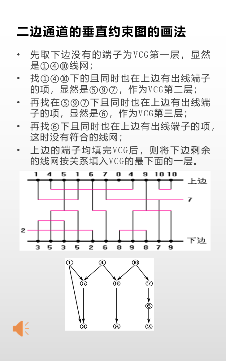 主要是考虑线网的排列顺序和如何走线。有多种算法,这里只考虑二边通道布线的算法。