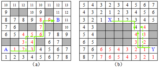 - 现要连接A→B,通过李氏算法的单源波扩散可以找出一条无任何阻挡的最短路径(阴影部分是布线障碍区),可见从A到B的最短路径为10步,共有有两种走法。